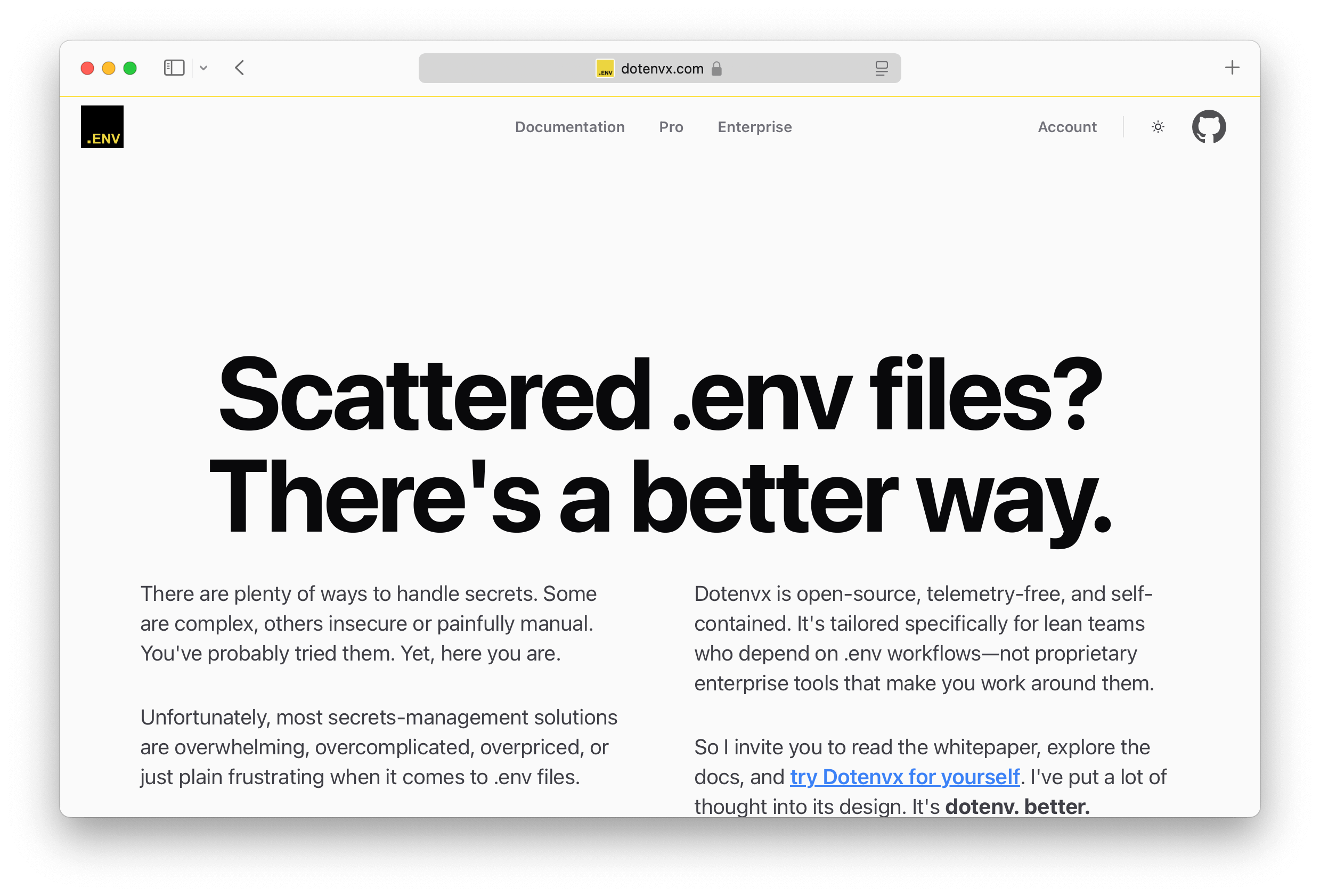 Dotenv made .env files a standard. Now I'm focused on solving their biggest security flaw – lack of encryption.