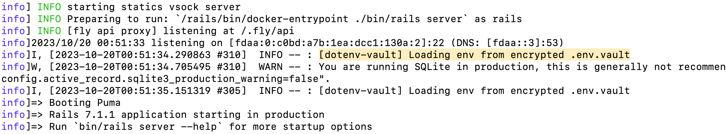 flyctl secrets set RAILS_ENV=production DOTENV_KEY='dotenv://:[email protected]/vault/.env.vault?environment=production'