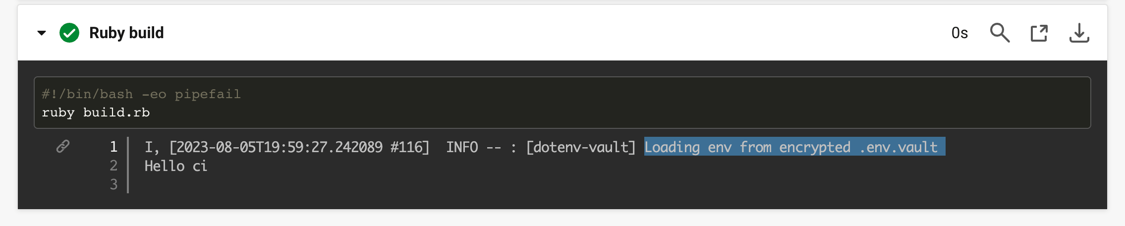That's it! On rerun, your .env.vault file will be decrypted and its CI secrets injected as environment variables – just in time. It will say Hello ci.